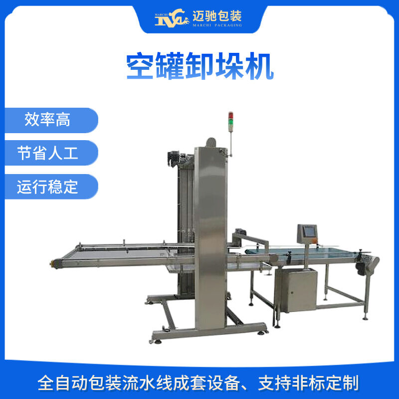 人工用地牛將整托盤空罐運至指定位置(碼垛方式為罐口向上),點動啟動按鈕,系統(tǒng)會自動通過光電檢測確定空罐托盤高度,根據(jù)后面緩存皮帶對罐子的需求,將一層空罐通過刮板推至緩存面板上,然后再調(diào)整上下高度與后道的緩存皮帶進行高度對接,再將空罐送至緩存皮帶上待用。緩存皮帶會根據(jù)理罐機對罐子的需求,將罐源源不斷的送至理罐機上。卸垛機每卸完一層空罐,設(shè)備自動提醒,收到提醒后人工將兩層空罐之間的紙板拿走,直至整個托盤上的空罐全部卸完,再進行下一個循環(huán)。